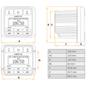 Den nye Hertz marineradioen har en rettlinjet design for å passe perfekt inn med de siste trender til de mest prestigefylte instrumentleverandørene. Senter av fronten er stort display med store marinesertifiserte knapper, symetrisk plassert over og under.