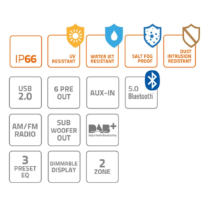 HMR 18D er spesiallaget for å forvandle eventyrene dine på vannet, og kombinerer avansert teknologi, sømløs tilkobling og eksepsjonell lydkvalitet, nå forbedret med integrert DAB+ digital radio. Denne funksjonsrike kildeenheten er den ultimate lydkompanjongen for din marine livsstil. Nyt full kontroll over lyden ombord med to uavhengige soner, hver med sin egen dedikerte subwoofer-utgang – slik at du kan skreddersy lydbildet til forskjellige områder av båten og møte hver gjests unike preferanser. Med Bluetooth® 5.0-integrasjon og DAB+-klarhet sikrer HMR 18 D feilfri streaming og krystallklart radiomottak for en enestående lytteopplevelse på vannet.