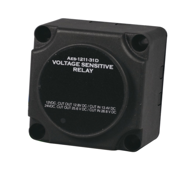 Dette reléet lader to batterier samtidig med en enkelt dynamo. Når motoren er slått på, forblir det spenningsfølsomme reléet åpent til startbatteriet når 13,7/27 V og lukker deretter kontakten og lader de 2 batteriene samtidig. Når motoren stopper og spenningen faller under 12,8/25,2 V, åpner det spenningsfølsomme reléet kontakten og holder de to batteriene adskilt, og forhindrer dermed feil batteri i å tømmes og unngår strømtopper som skader det elektroniske utstyret ombord når motoren startes. Den beskytter startbatteriet fra å tømmes på grunn av bruk av tjenester ombord. Ingen spenningsfall, null forbruk i stand by fase. Enkel å installere uten å endre generatorkablingen. 12/24 V automatisk valg.